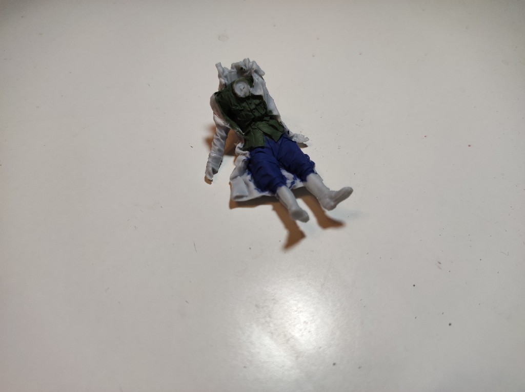 Der Gefallene hat noch eine kleine Kopfwunde erhalten. Außerdem habe ich schon die zweite Figur bemalt. Dieser ist schwer verwundet, vermutlich nach dem dieser Splitter ins Bein bekommen hat.
