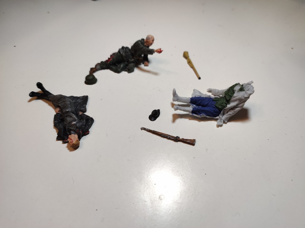 So z.B. bei den Figuren. Einige Modellbauer haben zwar kein Problem damit Militär zu bauen, wollen aber Leid und Tot ausblenden. Ich finde, dass man es mit darstellen sollte, da es einfach der Realität entspricht und vielleicht auch zum Nachdenken anregt.