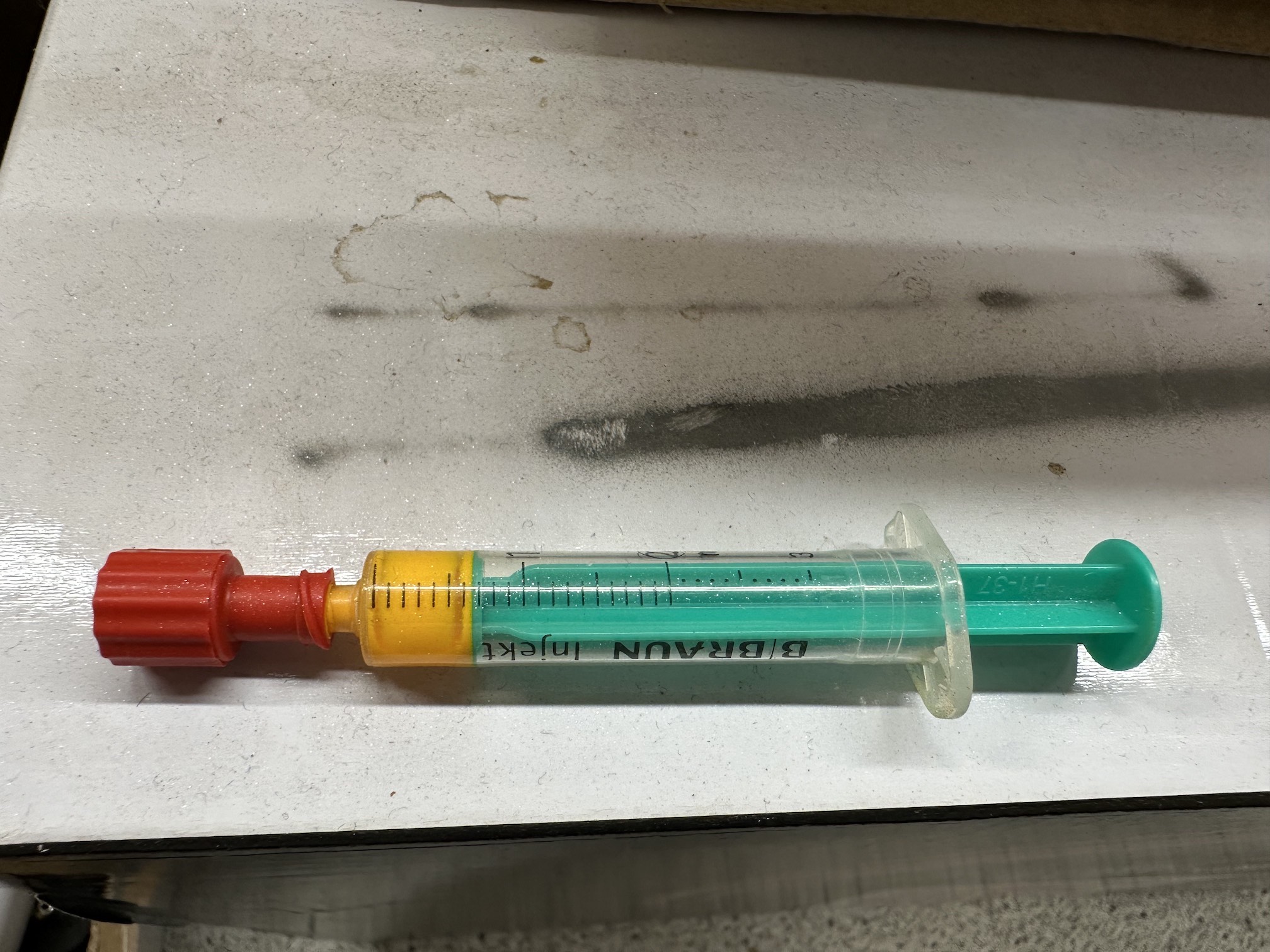 Die Farbe kann man auch über mehrere Wochen mit einem Verschlussstopfen in der Spritze lagern.