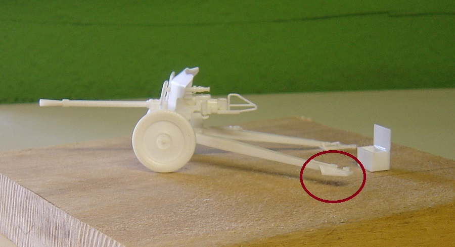 Die alte Bedienermannschaft plante mit Freunden eine Kreuzfahrt auf der Nordsee bzw.im Ärmelkanal. Daher war bei der Übergabe der Pak an die neue Bedienermannschaft wenig Zeit, so das die Handbücher und auch eine Garantiekarte nicht übergeben wurde. Wie Du nun auf dem folgenden Bild siehst, war die Pak vom Hersteller Heller nicht mit Hacken am Erdsporn ausgerüstet. Dieses ist durch mich geändert worden. Außerdem war der linke Holm etwas schief. ( nach oben) Da sich die Vorbesitzer schon in Dünkirchen auf dem Schiff befanden konnten keine Garantieansprüche geltend gemacht werden.