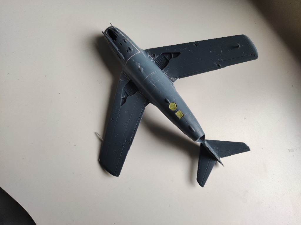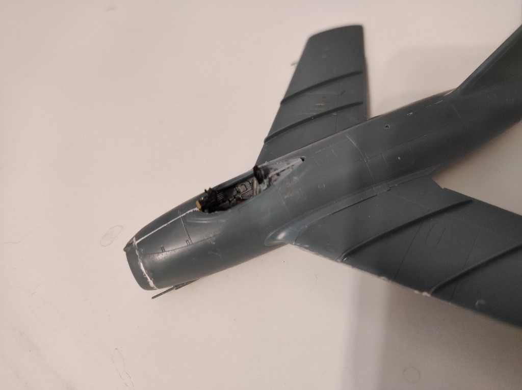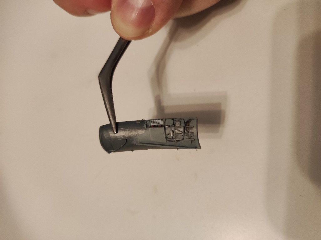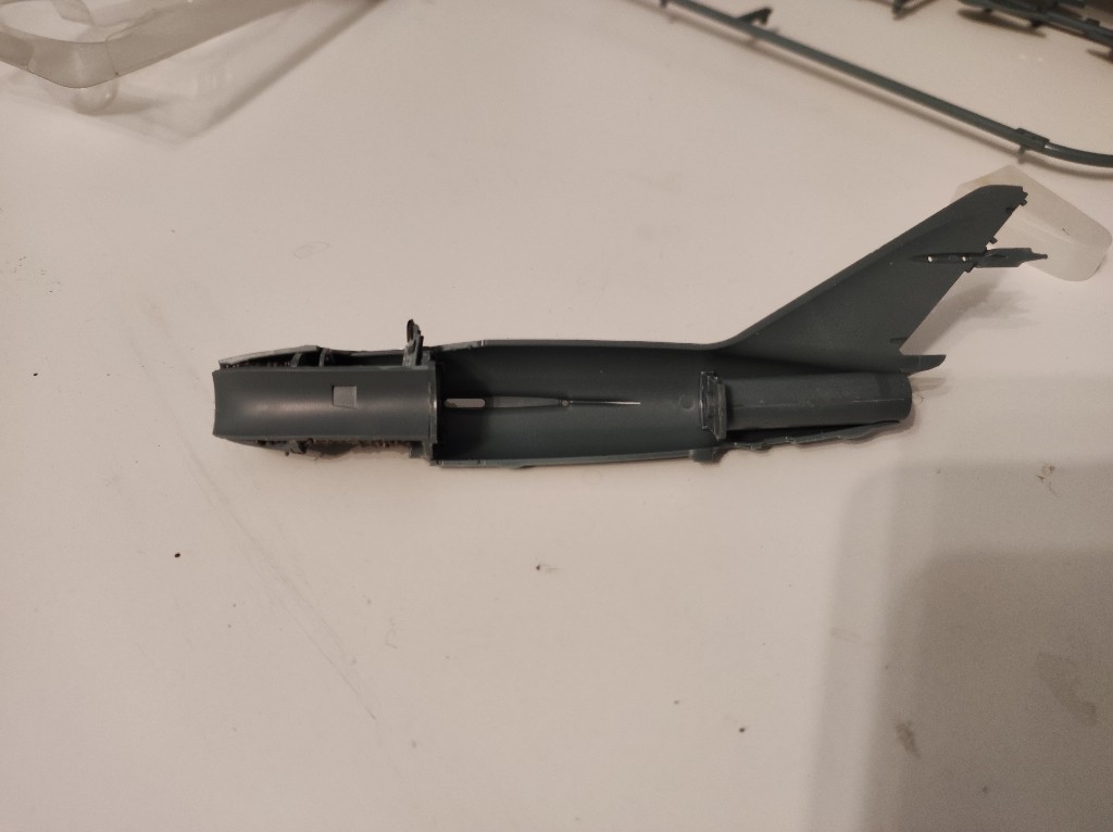 Während ich auf meine Ketten warte, werde ich mit der kleinen MiG weiter machen. Bereits Gestern nach der Kettenpanne am Jagdpanther habe ich das Cockpit in den Rumpf eingesetzt, ebenso das angedeutete Triebwerk