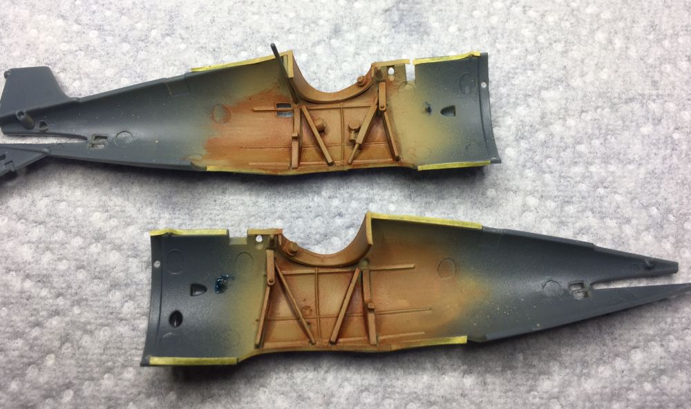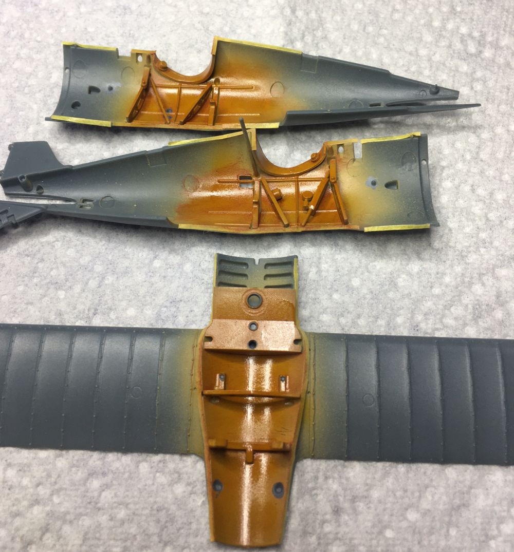 Jetzt ist die SSW grundiert. Der Rumpf mit Tamiya dunkelgelb, die Flügel mit Deck-Tan und der vordere Rumpf mit Alu. Bei bespannten Teilen habe ich es extra wolkig gehalten.
