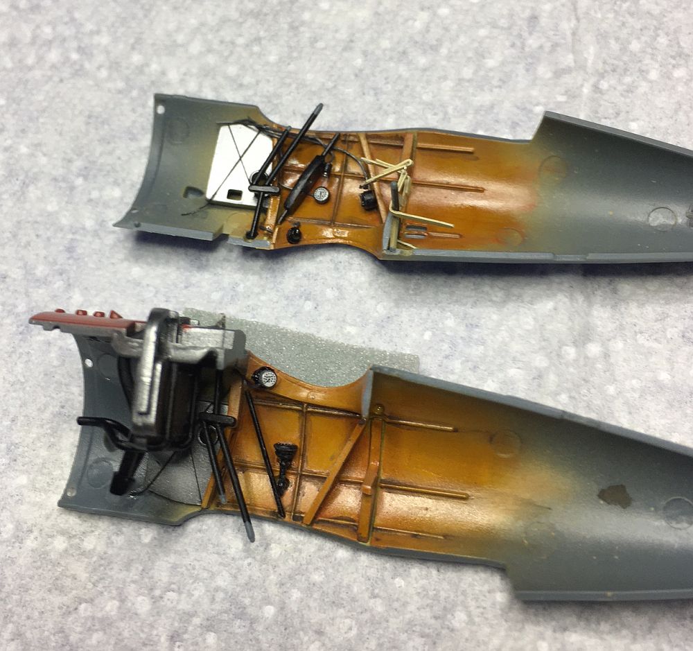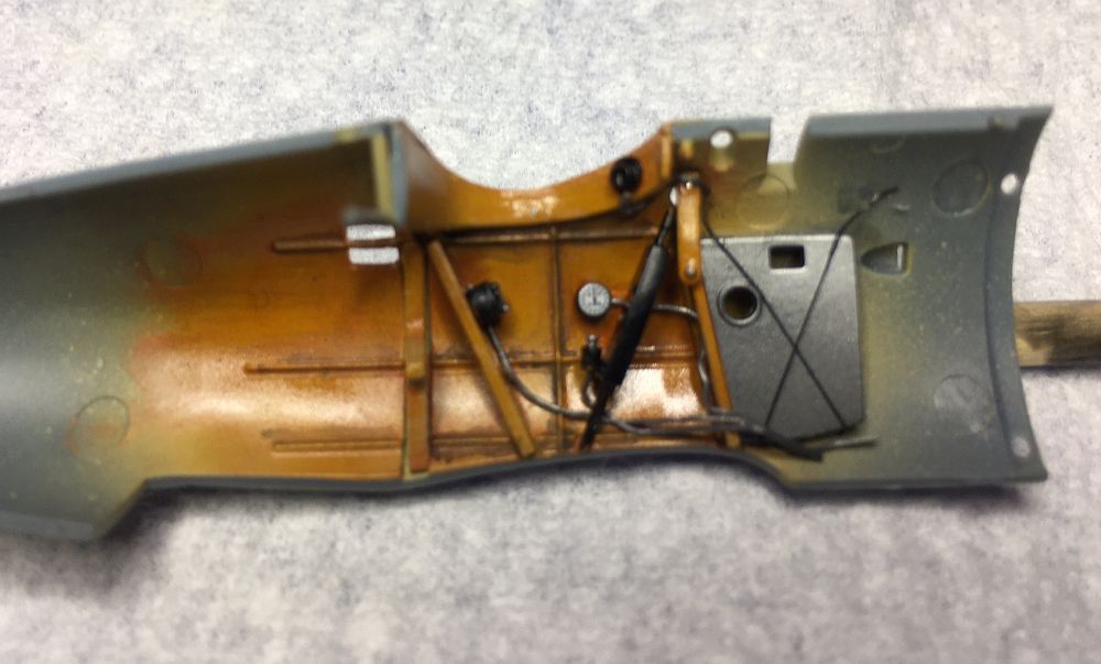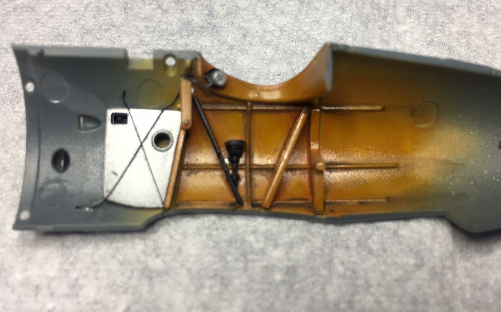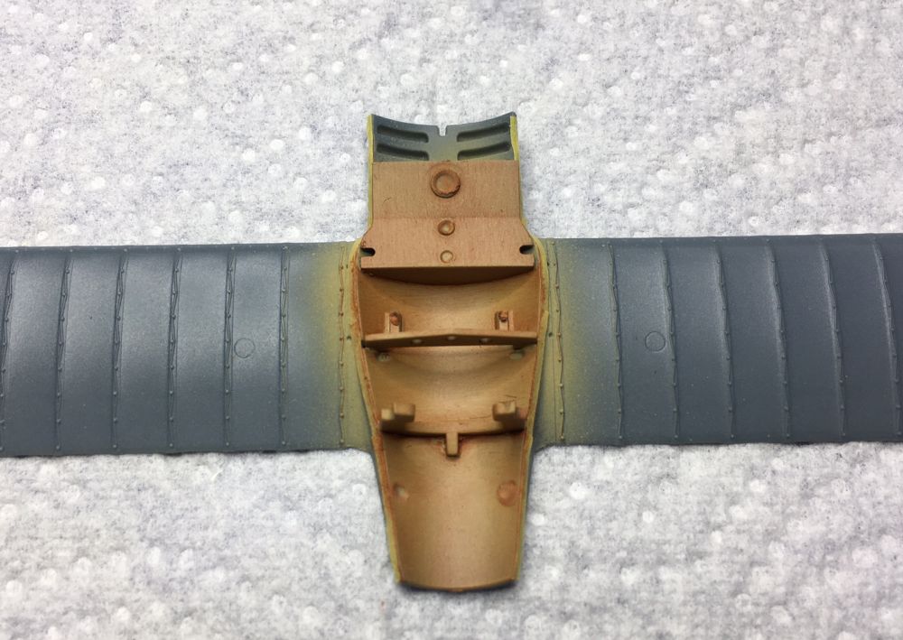 Die vordere Abdeckung, auf der die MGs platziert werden, habe ich bereits lackiert, da es nach der Montage schwierig werden könnte. Die Munitionszuführung wurde mit Alclad 2 Alu gesprüht.