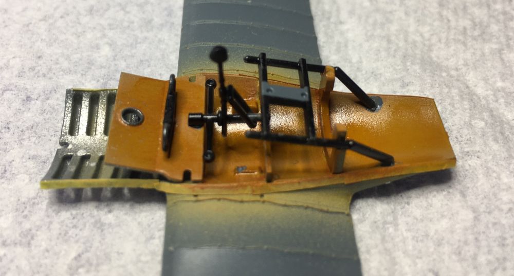 Ebenso bin ich mit dem Boden des Cockpits verfahren, welcher eins mit dem unteren Flügel ist. Wie man erkennt, ist die Flügelbespannung wirklich klasse. Die beiden Kringel auf dem Flügel sind mir erst auf dem Foto aufgefallen und werden natürlich noch eleminiert. Die Klebepunkte für weiter Teile habe ich mit Liquid Mask abgedeckt.