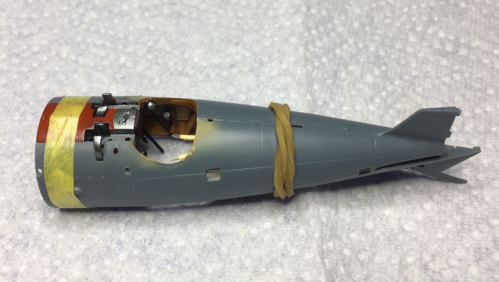 Den Hosenträgergurt habe ich an der Strebe befestigt, die später beide Rumpfhälften verbindet. Da das Unterteil mit Sitz von unten montiert wird, kann ich es später am Sitz ausrichten (so der Plan).
